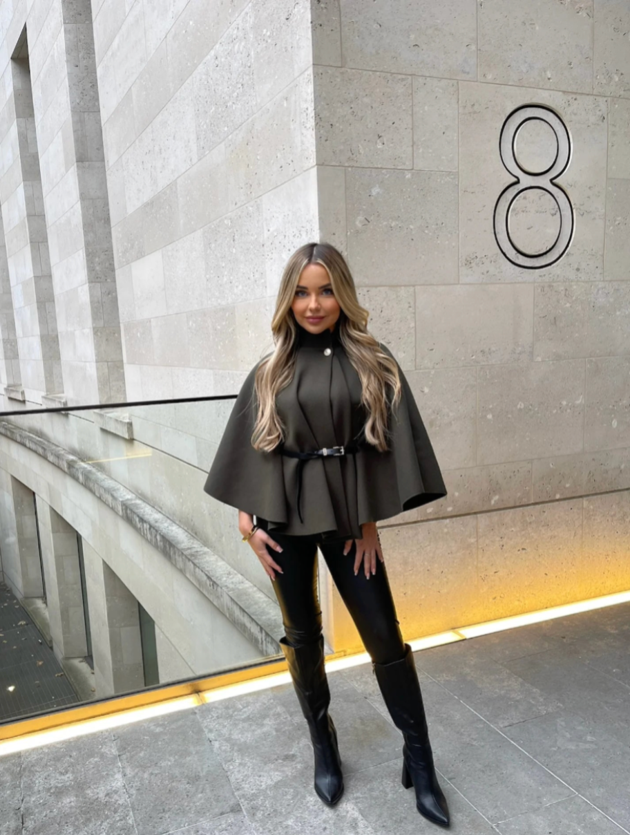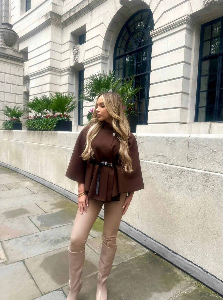 This elegant black cape coat instantly adds a chic touch to any outfit. The slim belt accentuates your figure, and the high collar creates a stylish look that keeps you warm. This is the perfect statement piece to complete your look on colder days.