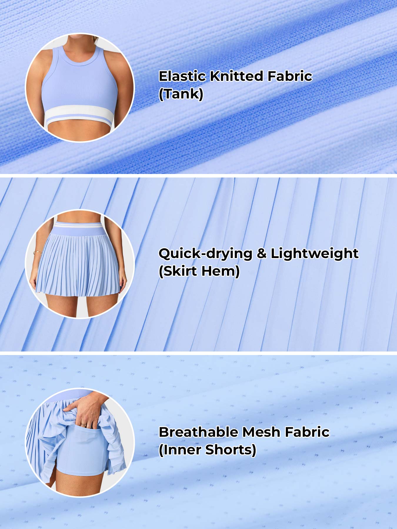 Step onto the court with streamlined confidence. The Hebe tennis outfit set pairs a sleek racerback tank with a playful pleated skirt—designed for movement, breathability, and all-day energy. Four-way stretch and built-in support keep you ready for every serve, swing, and stride.
