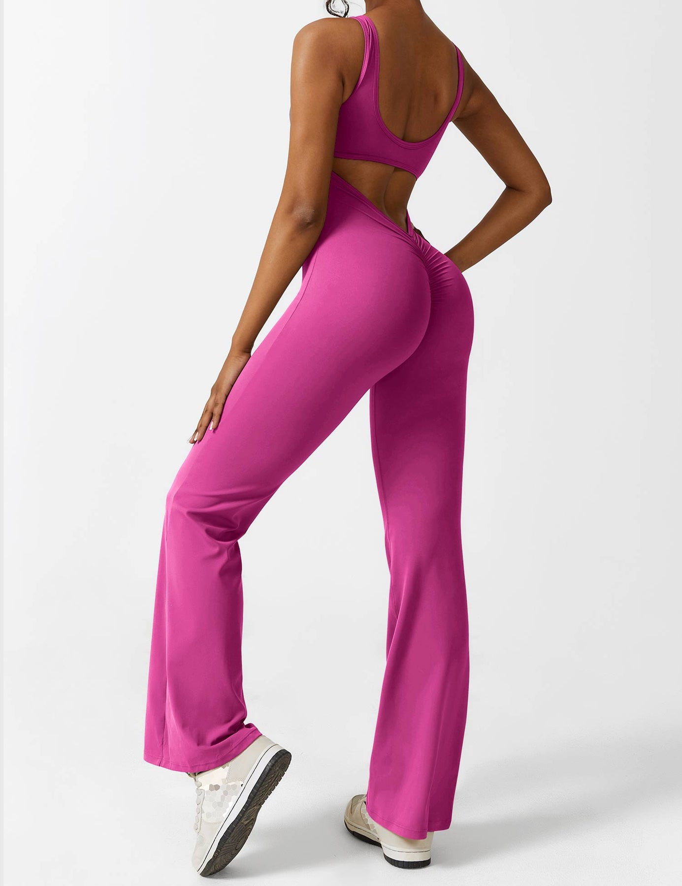 Elevate your style with the chic Lizvette Jumpsuit! This stunning piece features a daring deep V-cut back and flattering pleats that enhance your curves for that perfect peach-like silhouette. Its flared design elongates your legs, making it ideal for yoga, workouts, or effortless everyday wear.
